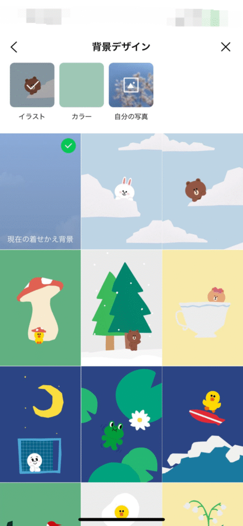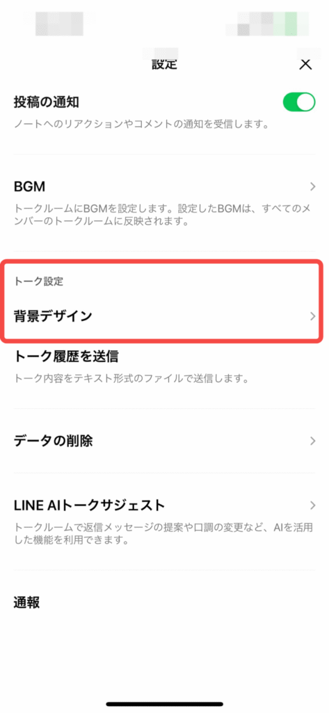 トーク画面から右上のメニューを開き、その他へ進み背景デザインを選択。