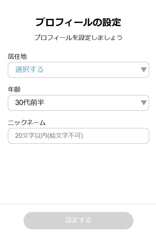 次に、「所在地」「年齢」「ニックネーム」を入力します。